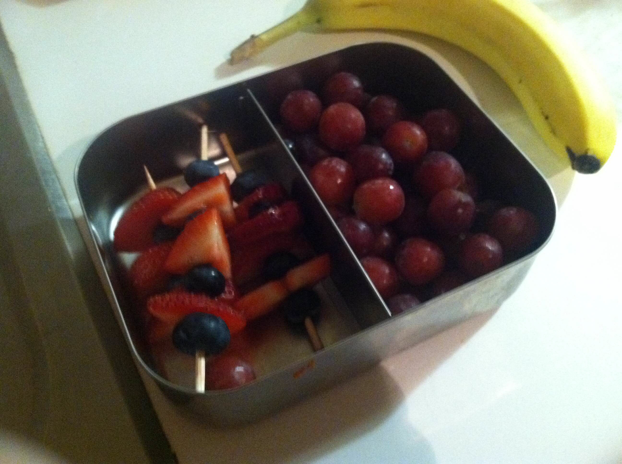 I cut up fresh mango, strawberries and blueberries, placed them in Tupperware containers and I will grab those for my afternoon sweet tooth snack on my commute home!